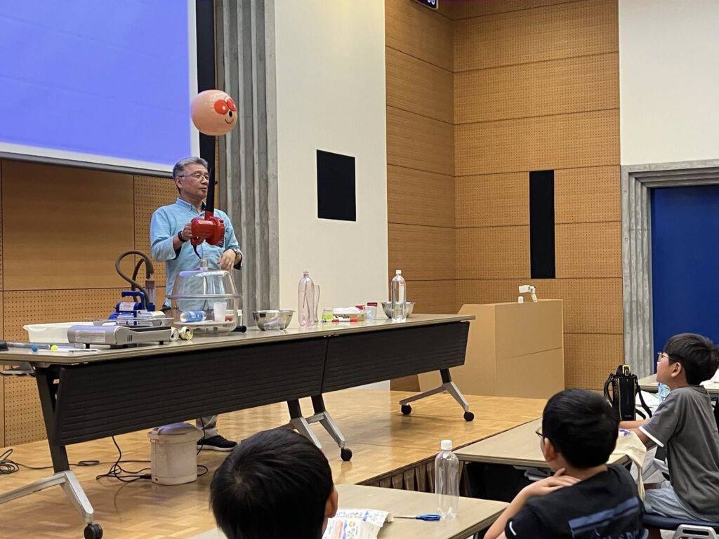 まず、宇宙の環境や空気の存在について考えるきっかけとして、「真空チャンバーを使った真空実験」や「アンパンマンの空中散歩」などの演示実験を実施しました。普段は意識しにくい“空気の力”を目の前で見ることで、子どもたちは科学への興味をぐっと深めていました。